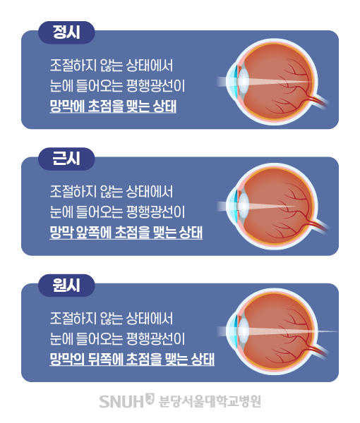 - 근시 : 근시는 가까운 물체는 잘 보이지만, 먼 물체가 흐릿하게 보이는 상태에요. 이는 안구의 길이가 길어져서 발생하는데, 빛이 망막 앞에 초점을 맞추게 돼요.