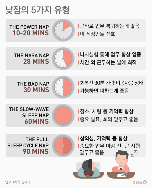 NASA 낮잠은 28분 동안 자는 것이에요. 이 시간은 연구에 따르면, 업무 성과를 높여주고 리프레쉬하는 데 최적인 시간이라고 해요. 바쁜 직장인들에게 추천해요!