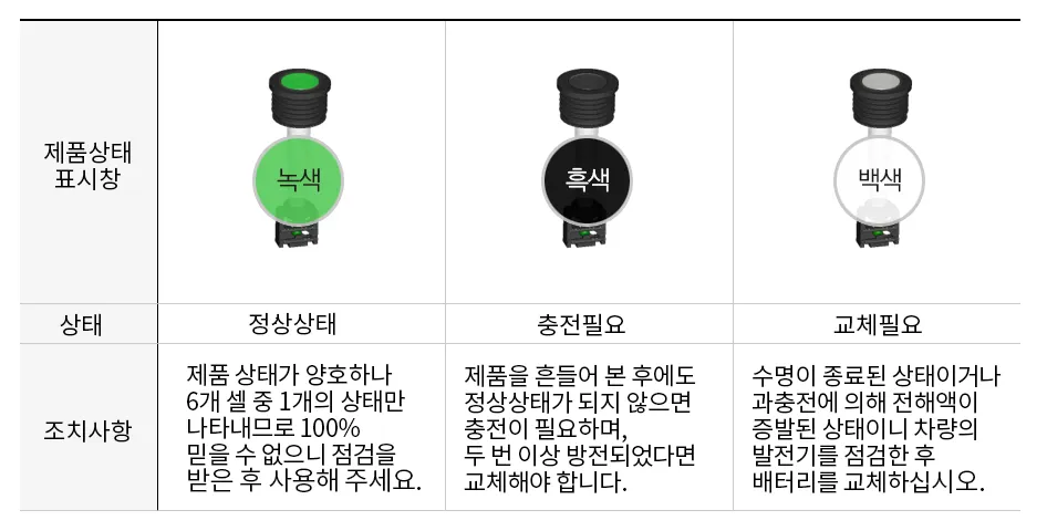 배터리의 상태를 확인하는 간단한 방법이 있어요. 일부 배터리에는 색상 지시등이 장착되어 있어요. 이 지시등은 배터리의 상태를 알려주는데, 녹색은 정상, 흰색은 교체 필요, 검은색은 충전이 필요하다는 신호예요.