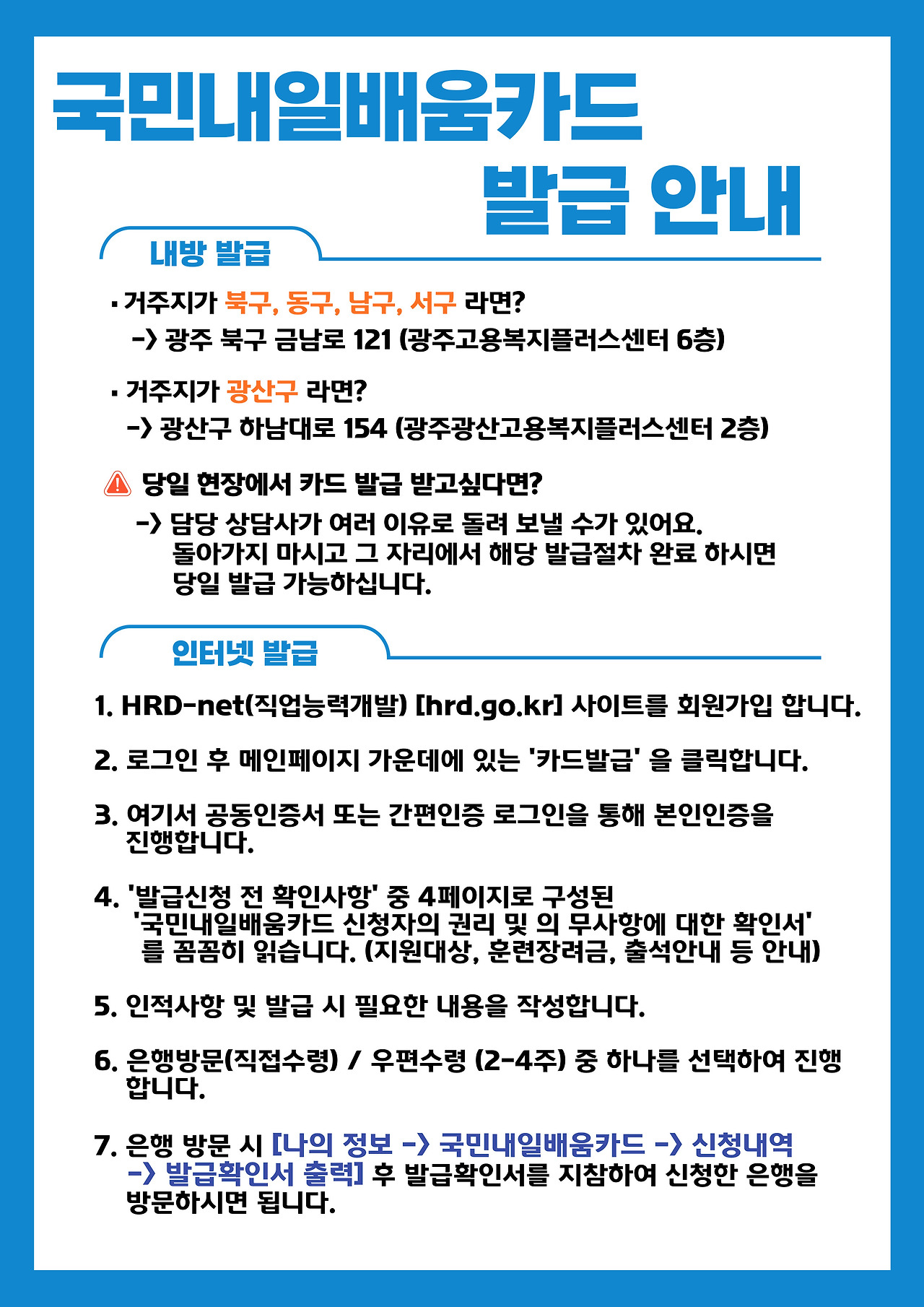 내일배움카드는 전국의 고용센터에서 신청할 수 있어요. 각 지역별 고용센터의 주소는 HRD-Net 웹사이트에서 확인할 수 있답니다. 예를 들어, 광주 지역의 고용센터 주소는 다음과 같아요.