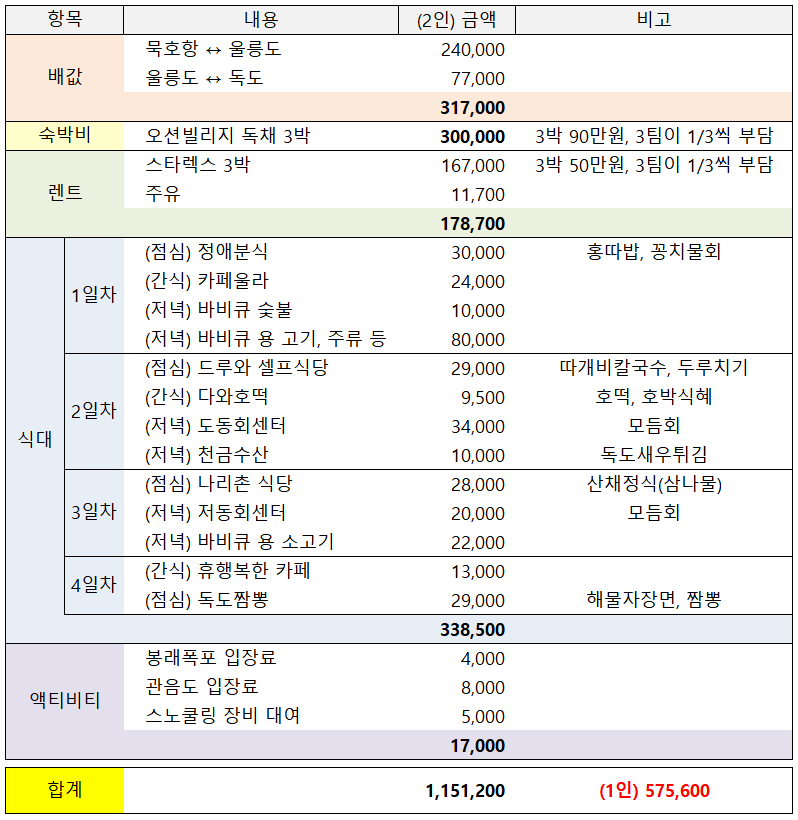 성수기에는 여행 비용이 다소 증가하는 경향이 있어요. 예를 들어, 두 명이 독도를 여행할 때의 비용을 살펴보면, 왕복 페리 요금, 숙박비, 식비, 활동비 등을 합쳐서 평균적으로 1,151,200원이 소요된다고 해요. 개인적으로는 약 575,600원 정도로 계산할 수 있죠. 이 비용은 숙박 시설과 식사 옵션에 따라 달라질 수 있으니 참고하시길 바랍니다.