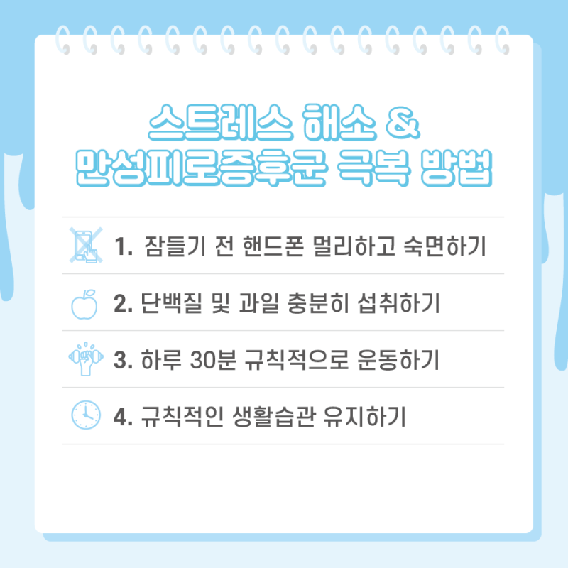 스트레스는 만성피로증후군을 악화시킬 수 있는 주요 요인 중 하나에요. 스트레스를 줄이기 위해서는 일상에서의 작은 변화가 필요해요. 예를 들어, 잠자기 전 스마트폰을 멀리하고, 충분한 단백질과 과일을 섭취하는 것이 도움이 될 수 있어요.