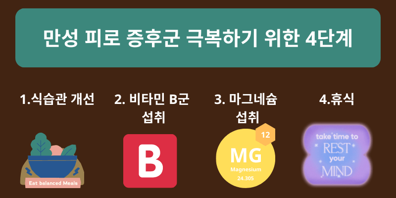 에서는 만성피로증후군 극복을 위한 네 가지 단계가 소개되어 있어요. 식습관 개선, 비타민 B 보충, 마그네슘 섭취, 충분한 휴식이 포함되어 있죠.