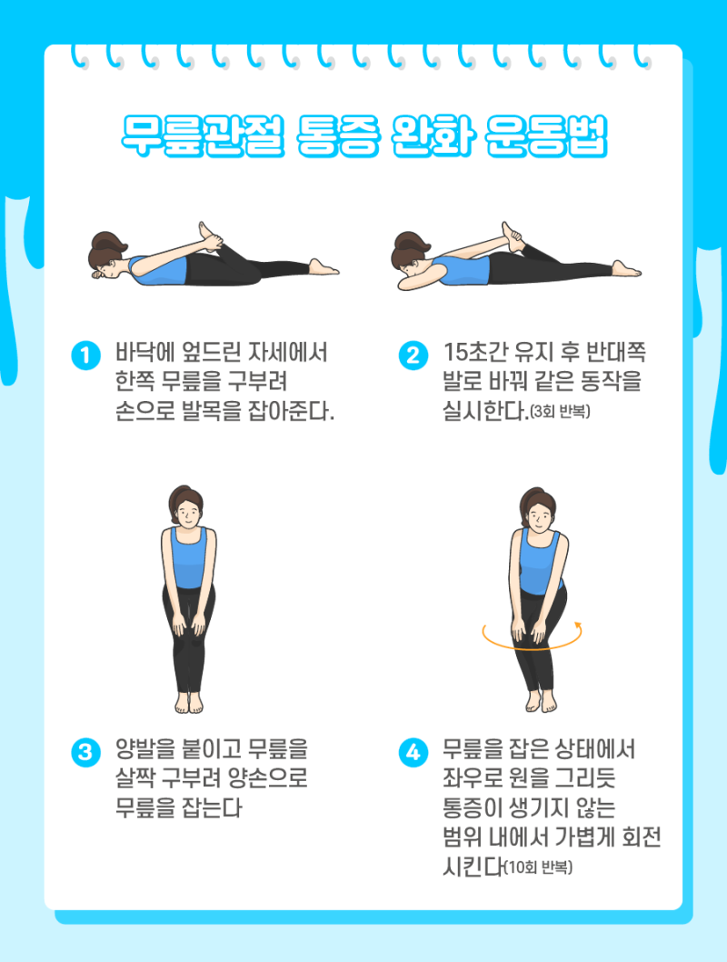 이런 운동들은 무릎의 근력을 강화하고 통증을 줄이는 데 도움을 줄 수 있어요.