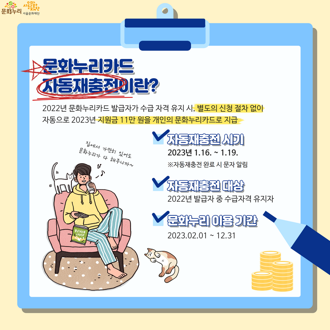 문화누리카드는 자동 재충전 시스템도 운영하고 있어요. 일정 기간 동안 사용하지 않은 경우, 자동으로 잔액이 충전되니, 잊지 말고 확인해보세요. 2023년에는 1월 16일부터 19일까지 자동 재충전이 이루어졌답니다.