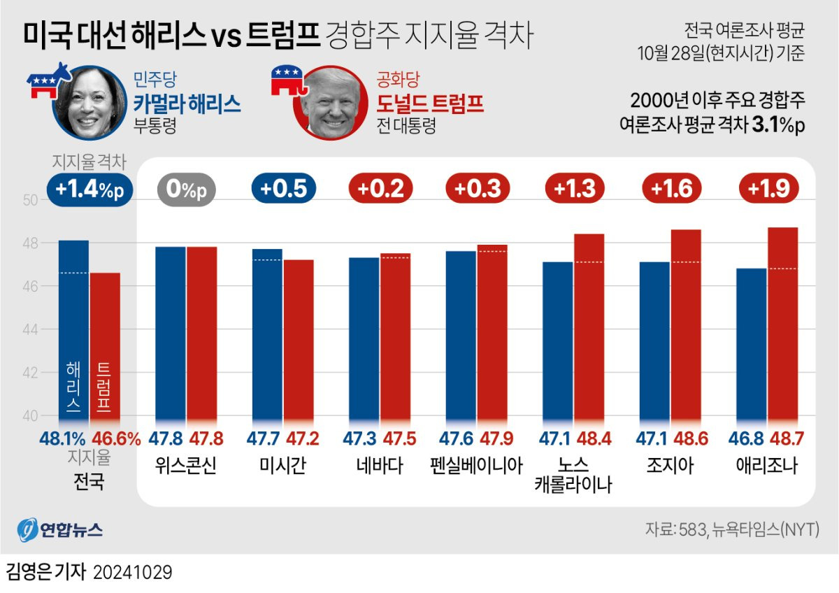 에서는 전국적으로 해리스가 48.1%로 트럼프의 46.6%를 앞서고 있다는 결과도 보여주고 있어요.