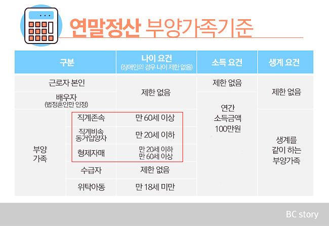 - 직계존속 : 부모님은 60세 이상이어야 하며, 소득이 100만 원 이하일 경우 공제를 받을 수 있어요.
