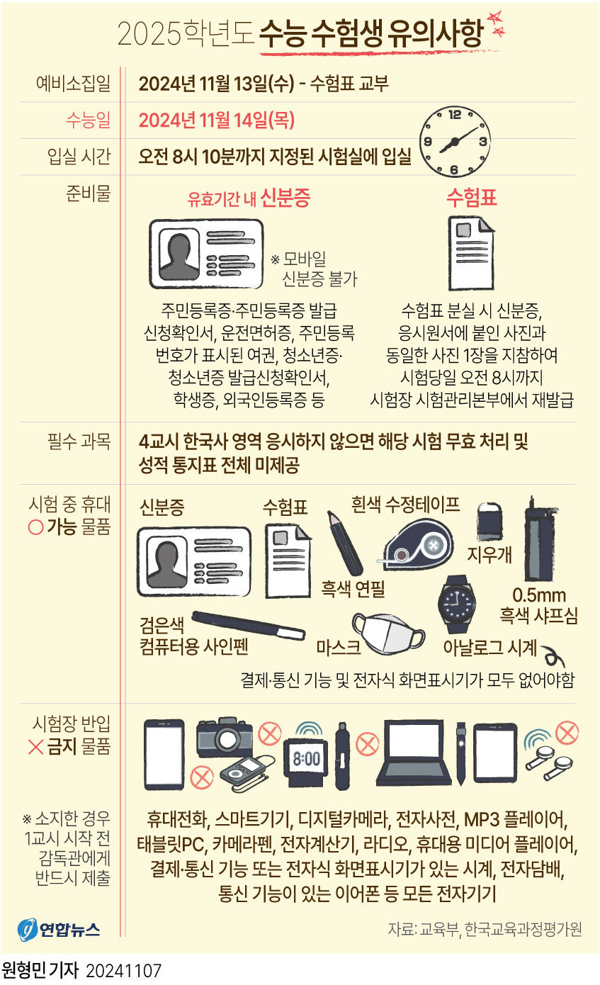 이 이미지는 수능 준비물에 대한 정보를 제공합니다. 또한, 마스크와 같은 방역 물품도 필수로 준비해야 하니 잊지 마세요.