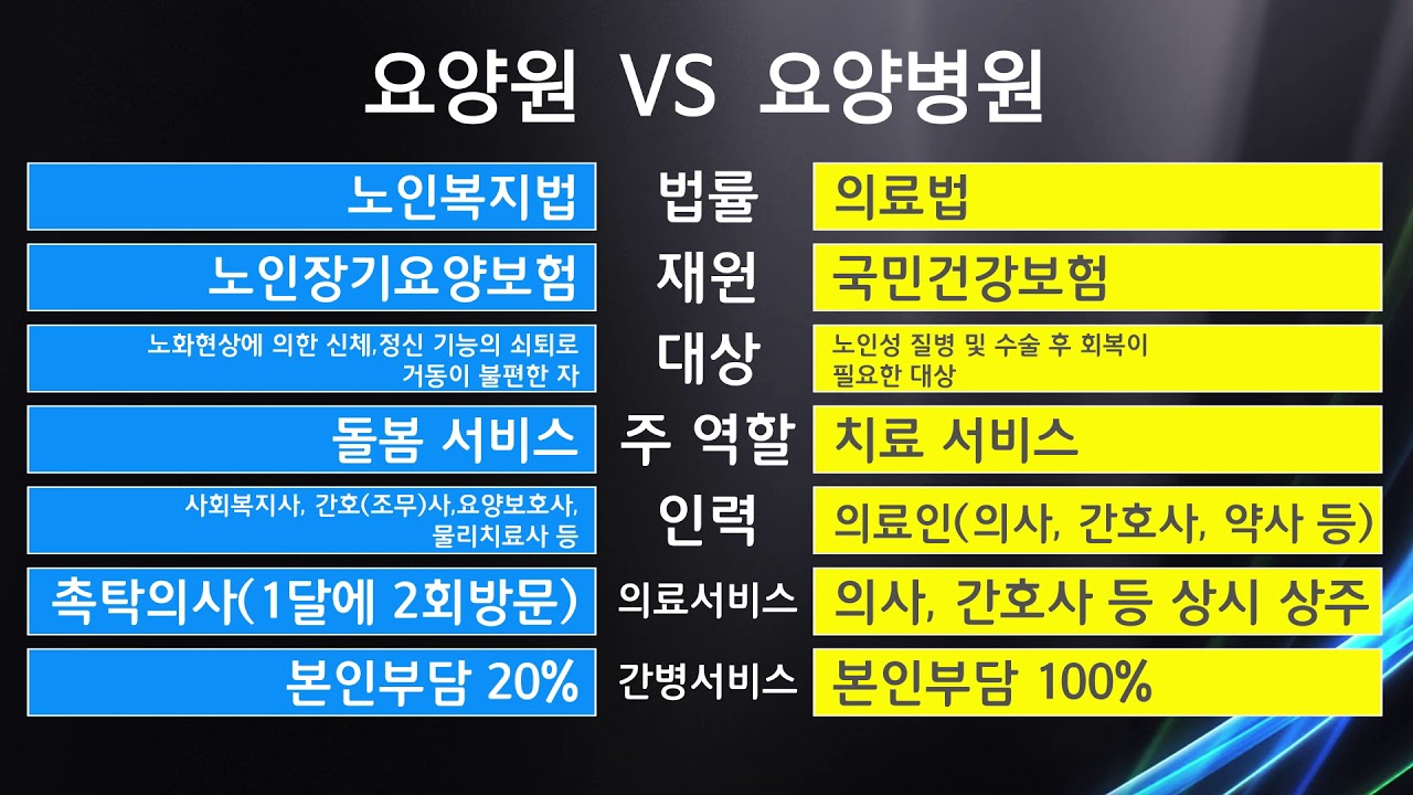 한국의 건강보험관리공단에서는 요양병원과 요양원에 대해 각각 다른 지원 체계를 운영하고 있어요. 요양병원은 의료법에 따라 운영되기 때문에, 의료 서비스 제공에 대한 지원이 주어지고요. 요양원은 노인복지법에 따라 운영되며, 사회 복지 차원에서의 지원을 받을 수 있습니다.