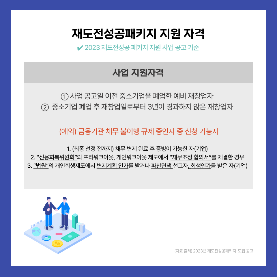 재도전 창업 패키지의 지원을 받기 위해서는 몇 가지 조건이 있어요. 먼저, 신청자는 사업이 중단된 후 3년이 지나지 않아야 하며, 특정 조건에 해당하는 경우 예외가 적용될 수 있습니다. 예를 들어, 금융기관의 채용 제한을 받는 경우도 지원받을 수 있죠. 신청을 원하신다면 반드시 자격 조건을 잘 따져보셔야 해요.