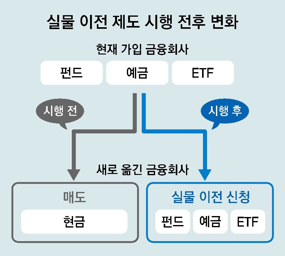 - 이전 신청 및 검토 : 가입자는 원하는 금융회사에 실물이동 신청을 하게 됩니다.