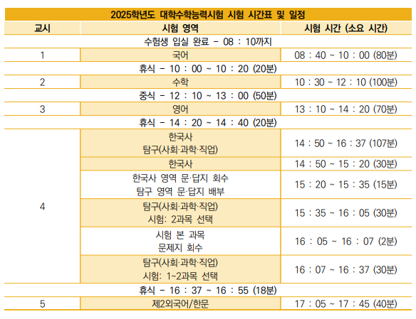 수능 시간표는 수험생들이 가장 궁금해하는 부분 중 하나죠. 아래는 2025학년도 수능 시간표입니다.