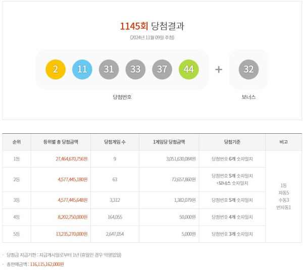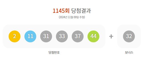 가장 먼저, 로또 1145회 결과를 살펴보겠습니다. 당첨번호는 2, 11, 31, 33, 37, 44이며, 보너스 번호는 32입니다. 이 번호들은 2024년 11월 9일에 발표되었고, 당첨금 총액은 무려 27.5억 원으로, 1등에 대한 당첨자는 총 9명이었어요. 그러니까 각 당첨자는 약 3.1억 원씩 받는 셈입니다.